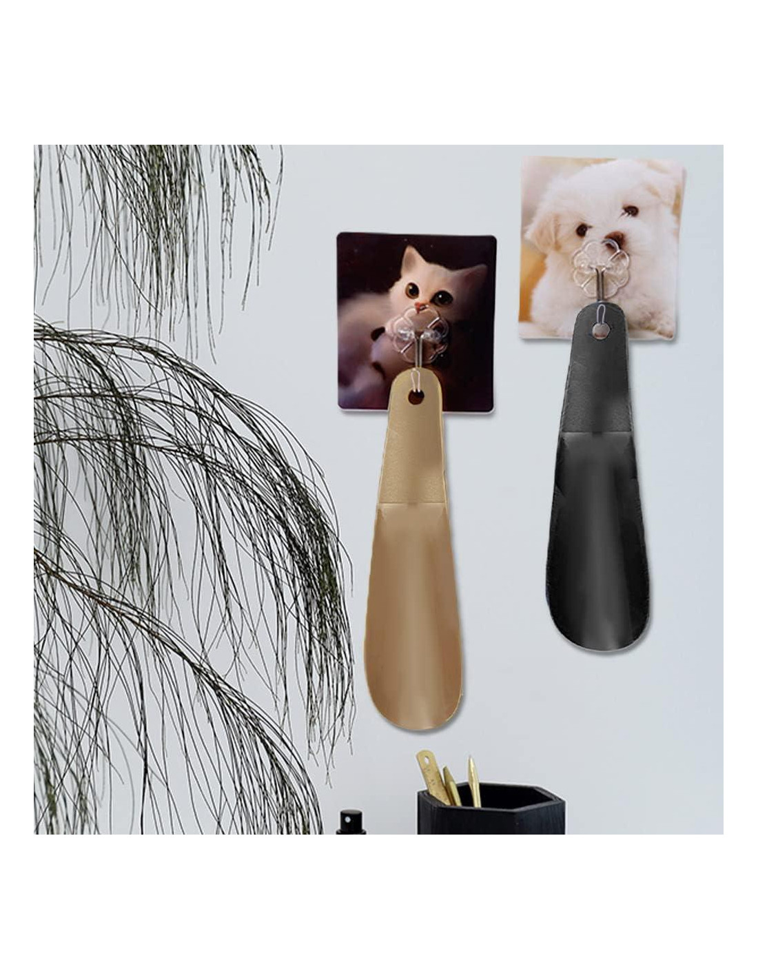 - [Paquete incluido] : Juego de 4 cuernos de zapato de plástico. 2 de cada color: negro y caqui
