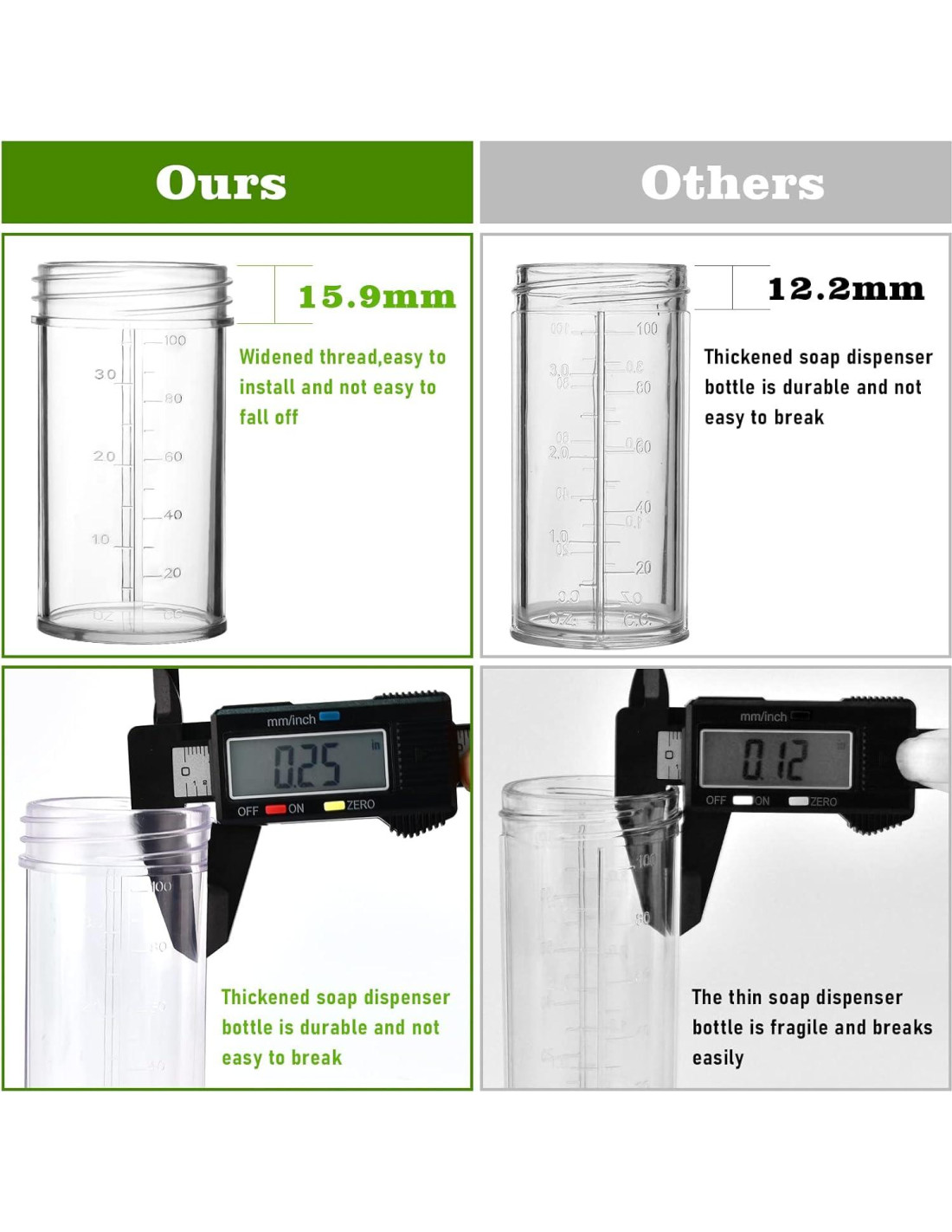- Botella de Dispensador de Jabón Mejorada: En comparación con otras, nuestras botellas dispensadoras de jabón son el doble de gruesas. La botella de jabón más gruesa es duradera y no fácil de romper. Conexión entre la botella de jabón y la pistola de espuma donde aumentamos el ancho de la rosca, fácil de instalar y no fácil de caer.