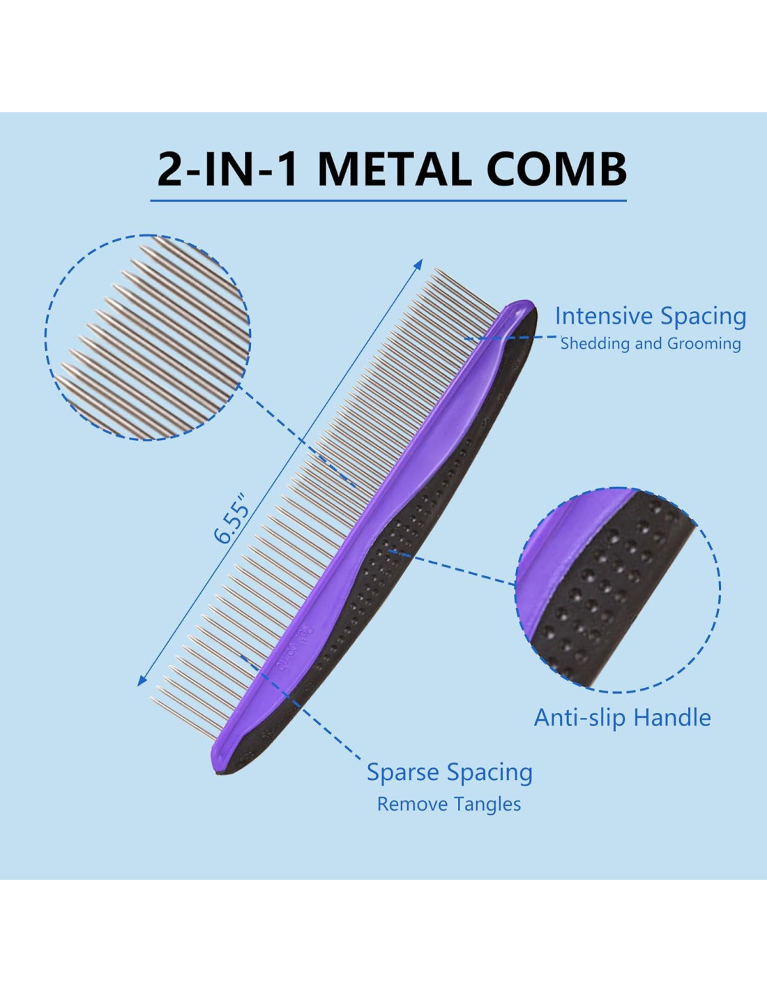 - [Cepillo para Perros 2 en 1]: El espaciado escaso se puede combinar con el cepillo slicker para eliminar enredos, mientras que el espaciado intenso se combina con el rastrillo para subpelo para peinar el pelo.