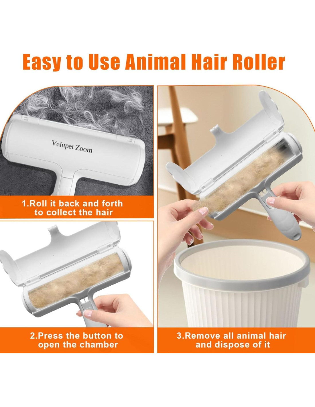 - Operación Sin Esfuerzo para Limpiezas Rápidas: Aborda fácilmente el pelo de mascotas en cualquier superficie, simplemente rueda en todas las direcciones (arriba, abajo, de lado a lado) para capturar cada hebra, ya sea en muebles, sofás o camas. El botón de un toque libera el pelo atrapado en el compartimento removible para una eliminación sin desorden, haciendo que esta herramienta de eliminación de pelo de mascotas para muebles y sofás sea fácil de usar a diario. Sin pasos complicados, solo rueda, recoge y vacía.