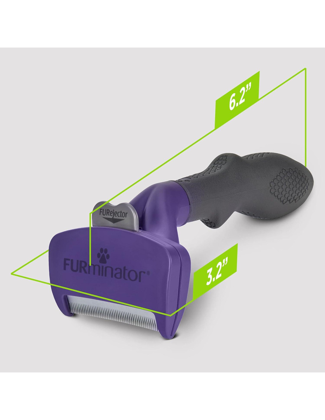 Toma tu rutina de aseo en tus propias manos implementando el Sistema de Reducción de Pelo FURminator: Cepillo, deShed, Bañar y Mantener para confianza en el aseo en la comodidad de tu hogar. Nuestras herramientas de deshedding, herramientas de aseo y soluciones para el pelo ofrecen un régimen de aseo adaptado a cualquier perro o gato. Si vives con mascotas, vives con pelo de mascota. Las soluciones de aseo FURminator reducen el pelo suelto de la caída hasta un 90% con uso regular. La herramienta de deshedding FURminator para gatos medianos y grandes, de pelo largo (más de 4.54 kilogramos) elimina el pelo caído y ayuda a reducir las bolas de pelo para menos desorden. Esta herramienta está especialmente diseñada para alcanzar a través de la capa superior para eliminar de manera segura y fácil el pelo suelto y la subcapa sin dañar la capa o cortar la piel. El mango ergonómico hace que el aseo sea fácil, y el botón FURejector libera el pelo con facilidad. Las herramientas de deshedding FURminator reducen el pelo suelto hasta un 90 por ciento con uso regular. Para mejores resultados, deshedda semanalmente para eliminar la subcapa y reducir el pelo caído. Usa con otros productos de aseo FURminator como parte de un régimen completo.