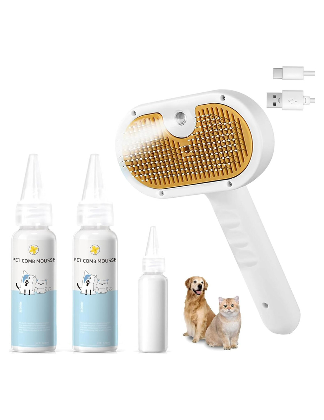 Cepillo de Vapor para Mascotas para Perro y Gato - Peine de Remoción de Pelo 3 en 1 con Spray - Cepillo de Vapor para Mudanza y Acicalamiento - Incluye 2 Botellas de Champú Sin Agua