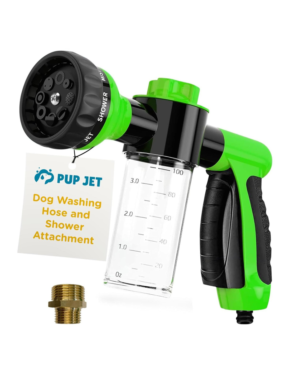 - Componentes incluidos: Accesorio de Cabeza de Ducha, Rociador de Lavado de Perros Pup Jet, Accesorio de Manguera de Jardín, Contenedor de Champú para Perros