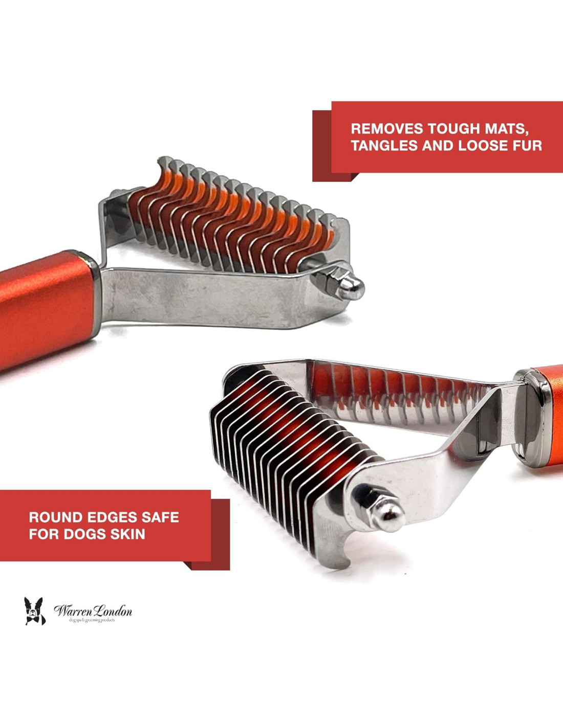 - Acicalador Profesional 2 en 1 - Las cuchillas de acero inoxidable de doble fila se deslizan a través de subpelo denso para desenredar esteras y capturar pelo suelto en un solo paso.