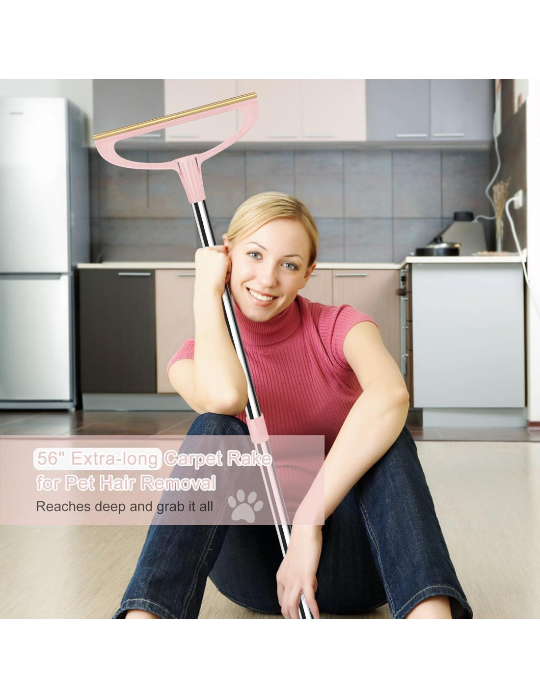 - LIMPIA DE PIE, NO MÁS DOLOR DE ESPALDA: ¿Cansado de arrodillarte en la alfombra para eliminar el pelo de gato/perro durante mucho tiempo con una herramienta de mango corto? Usa nuestro rastrillo para alfombra de mango largo de 142 cm (56 pulgadas), limpiando de pie y gastando menos tiempo arrastrándote sobre tus manos y rodillas. Con unos pocos movimientos puedes eliminar una sorprendente cantidad de pelo de perro rebelde en solo unos minutos.