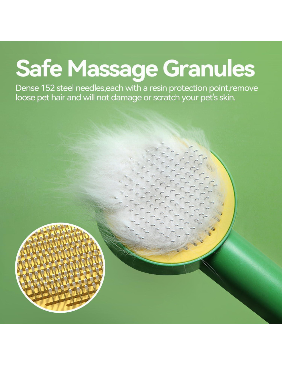 Densos 152 agujas de acero, cada una con un punto de protección de resina, eliminan el pelo suelto de las mascotas y no dañan ni raspan la piel de tu mascota. Hacer que la muda de pelo de tu mascota sea mucho más fácil y efectiva. Un botón para eliminar el pelo de la mascota. Eliminación de pelo sin esfuerzo. Se puede lavar directamente con agua después de su uso.