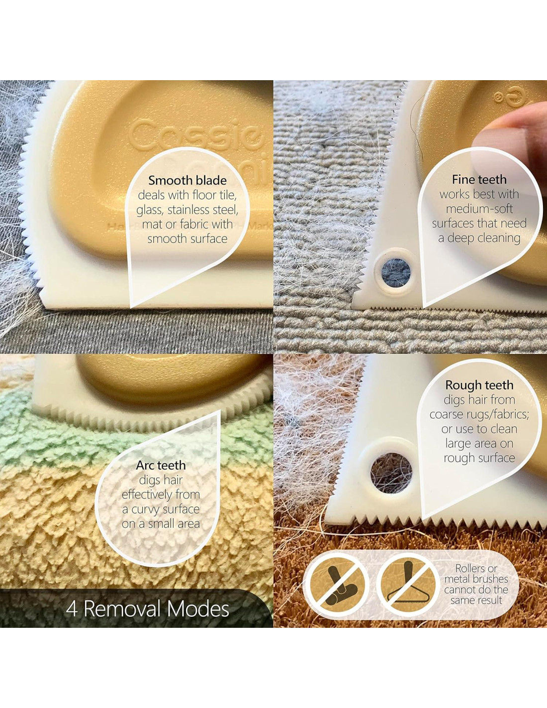 - 4 MODOS DE BARRIDO. Nuestro removedor de pelo de mascota mini para interiores y exteriores tiene cuatro modos para una limpieza eficiente. La Cuchilla Plana es adecuada para superficies lisas, como los azulejos de madera. El modo de Dientes Finos es ideal para telas de suavidad media. El modo de Dientes Ásperos aborda el pelo rebelde en alfombras gruesas de manera efectiva. El diseño de Dientes Arqueados extrae el pelo incrustado de superficies curvas. ¡Es notablemente efectivo, así que mantén una aspiradora a mano para recogerlo todo!