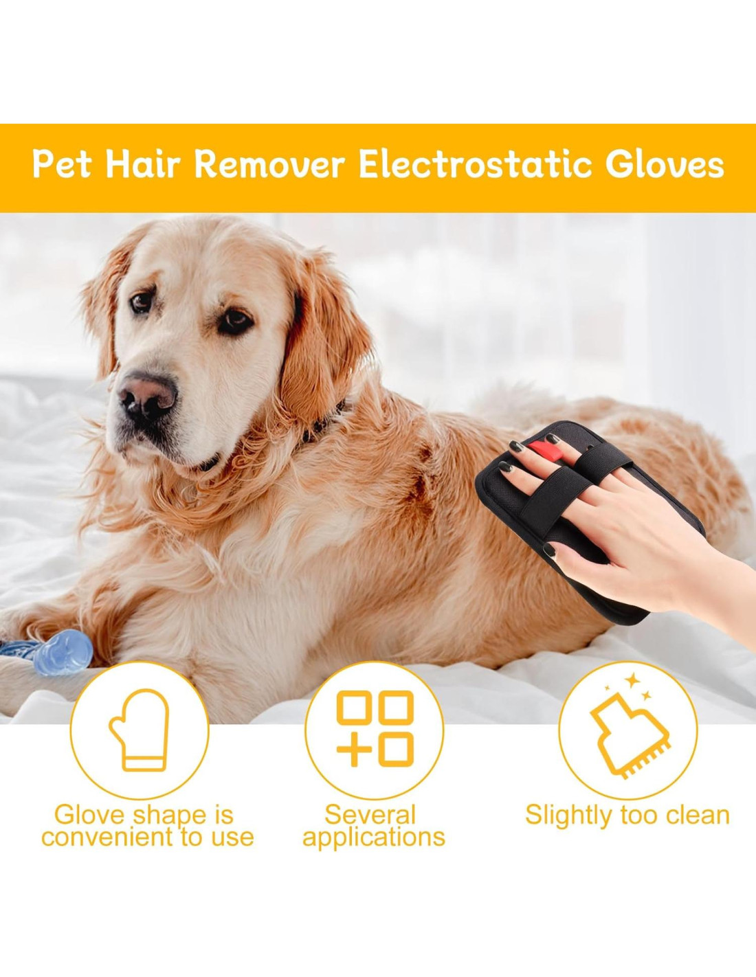 - Guante de Remoción de Pelo de Mascota El Guante de Remoción de Pelo de Mascota utiliza electricidad estática y un diseño único para recoger sin esfuerzo el pelo de mascota. Di adiós a los rodillos adhesivos y cepillos ineficaces, este guante es fácil de usar y muy efectivo para eliminar el pelo de mascota de la ropa, muebles y más