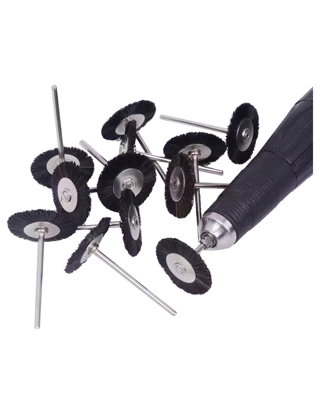 - Mini cepillo de pulido en forma de T con mango de 3/32 pulgadas (2.35 mm) que se adapta a herramientas rotativas o herramientas neumáticas