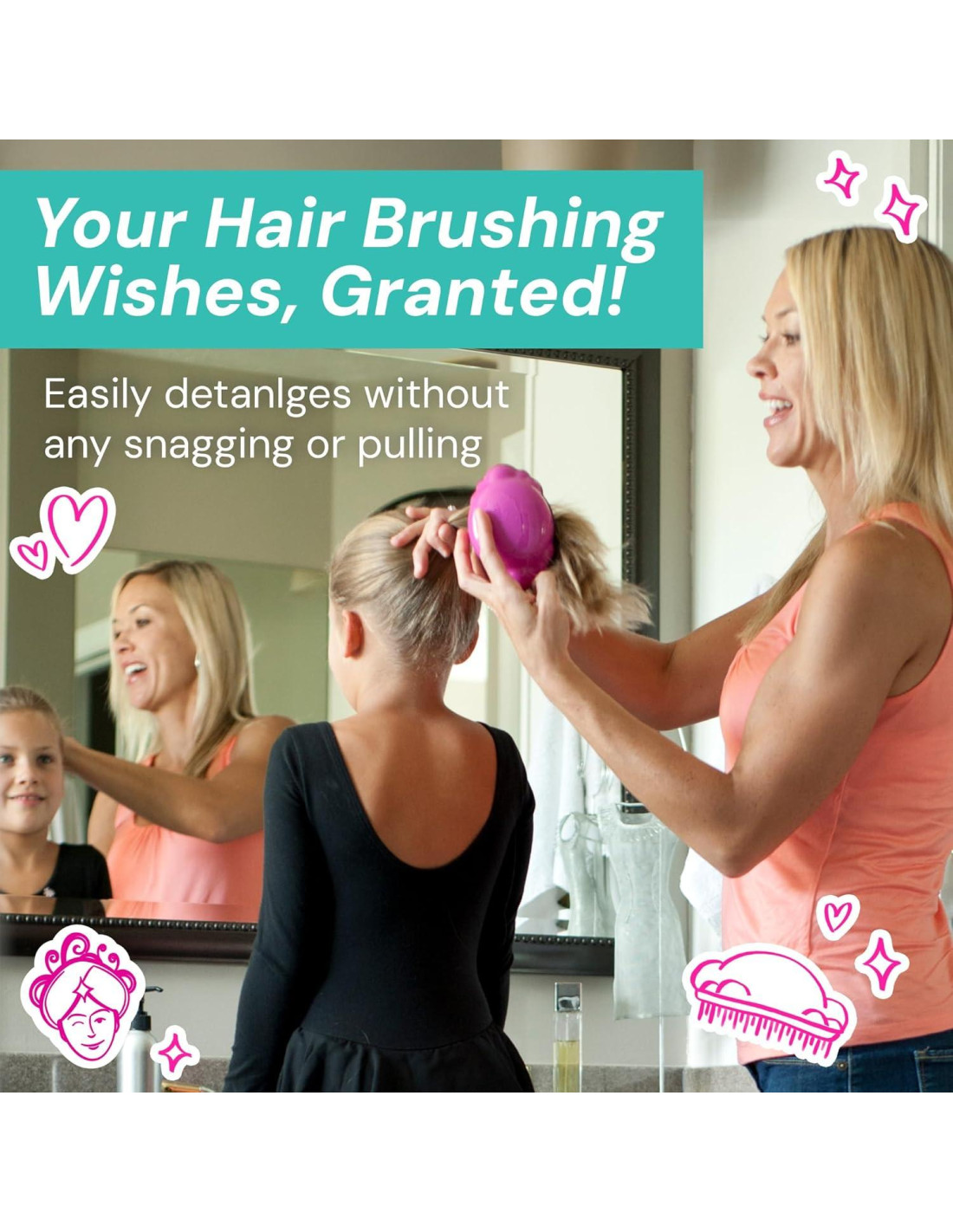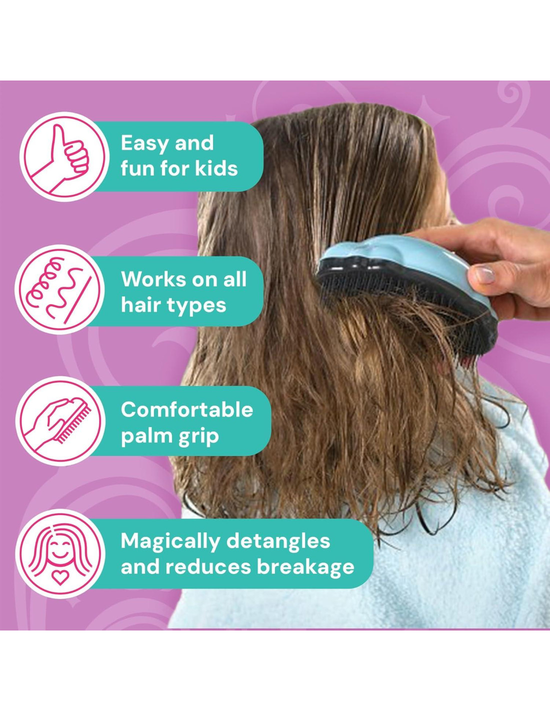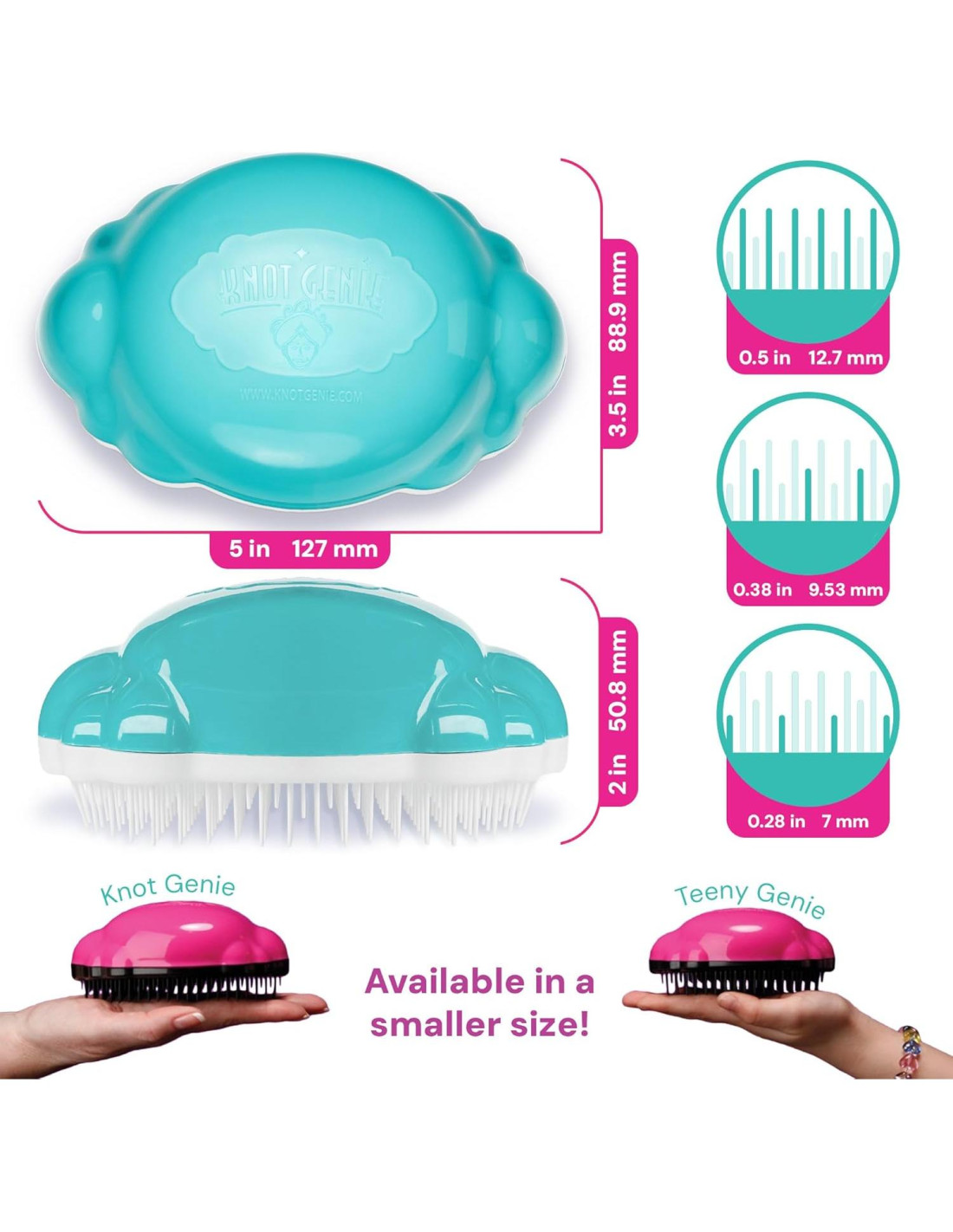 - Adaptable: ¡Di adiós a las luchas con el cabello! Knot Genie es tu solución versátil para todos los tipos de cabello. Ya sea que tu hijo tenga cabello rizado, ondulado, lacio o sintético, nuestro cepillo se desliza sin esfuerzo a través del cabello mojado o seco, haciendo que las rutinas de cuidado sean un paseo.