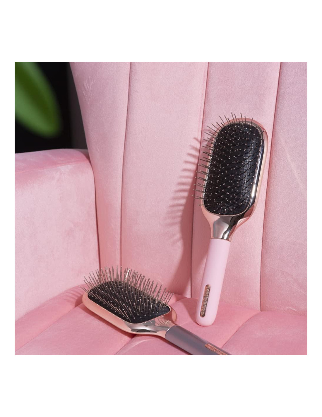 Las cerdas de acero inoxidable pulidas se deslizan suavemente a través de los enredos sin causar pérdida de cabello, quiebre o estática, dejando su cabello luciendo suave, liso y brillante.