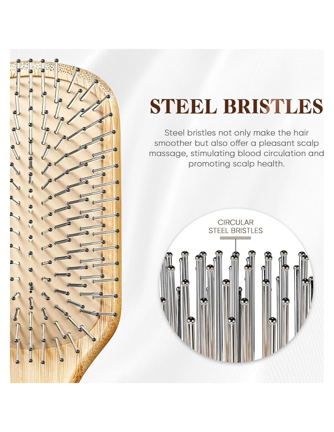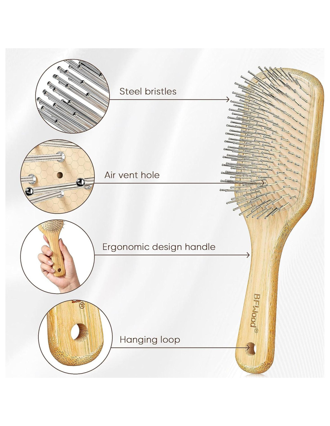 - Experiencia de Peinado Más Placentera: Este cepillo de bambú con cerdas de alambre no produce carga estática, por lo que tu cabello estará suave y libre de frizz