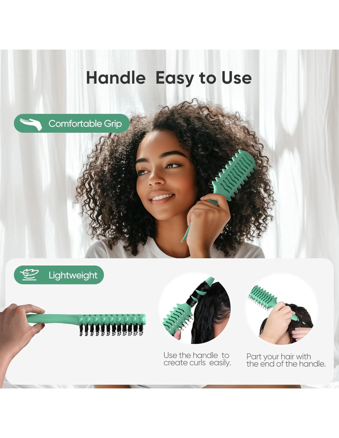 - Disfruta de Comodidad y Control: Con un mango antideslizante y un agarre cómodo, nuestro Cepillo Definidor de Rizos te permite maniobrarlo fácilmente durante sesiones prolongadas de secado o peinado, dándote un control preciso sobre tu cabello