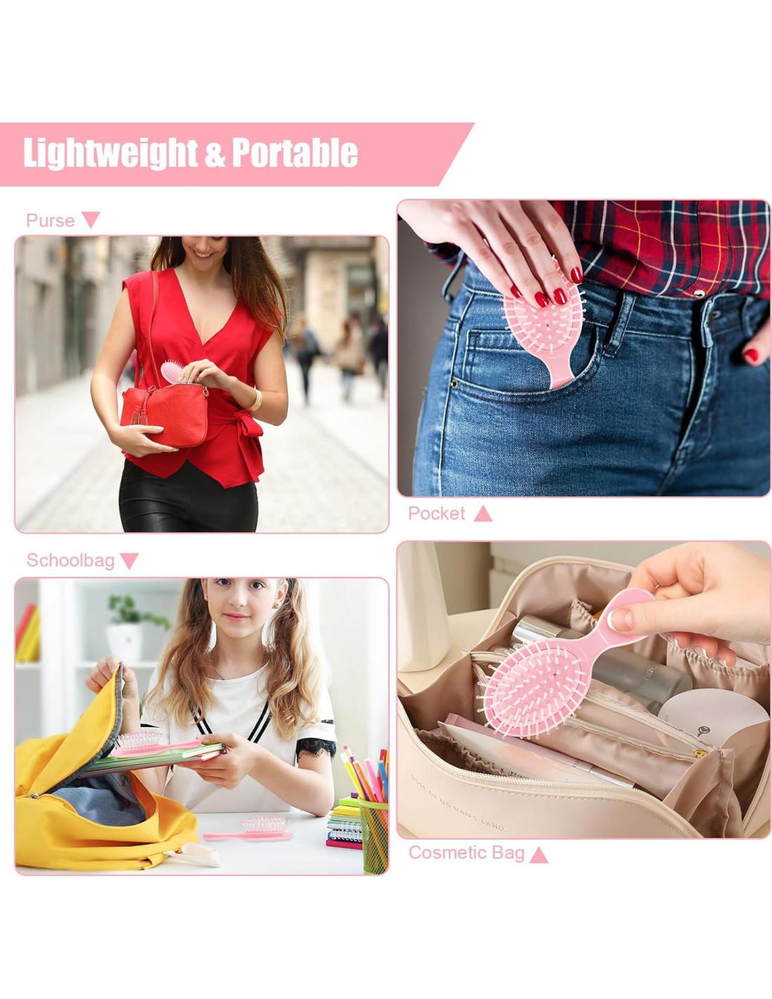 - Portátil y Ligero: Nuestro cepillo de pelo mini de viaje NICEMOVIC es compacto y ligero, diseñado con un mango antideslizante, lo que facilita su sujeción y uso. Su tamaño de viaje permite que quepa perfectamente en tu bolsillo, bolso, mochila, bolsa de gimnasio, mochila escolar, bolso de mano, bolsa de maquillaje o equipaje. Ya sea que estés viajando, en casa, en la oficina, en un hotel, de vacaciones, en un dormitorio, en el coche, en la escuela o dirigiéndote a un salón de belleza o spa, estos cepillos de viaje mini son siempre esenciales de viaje.