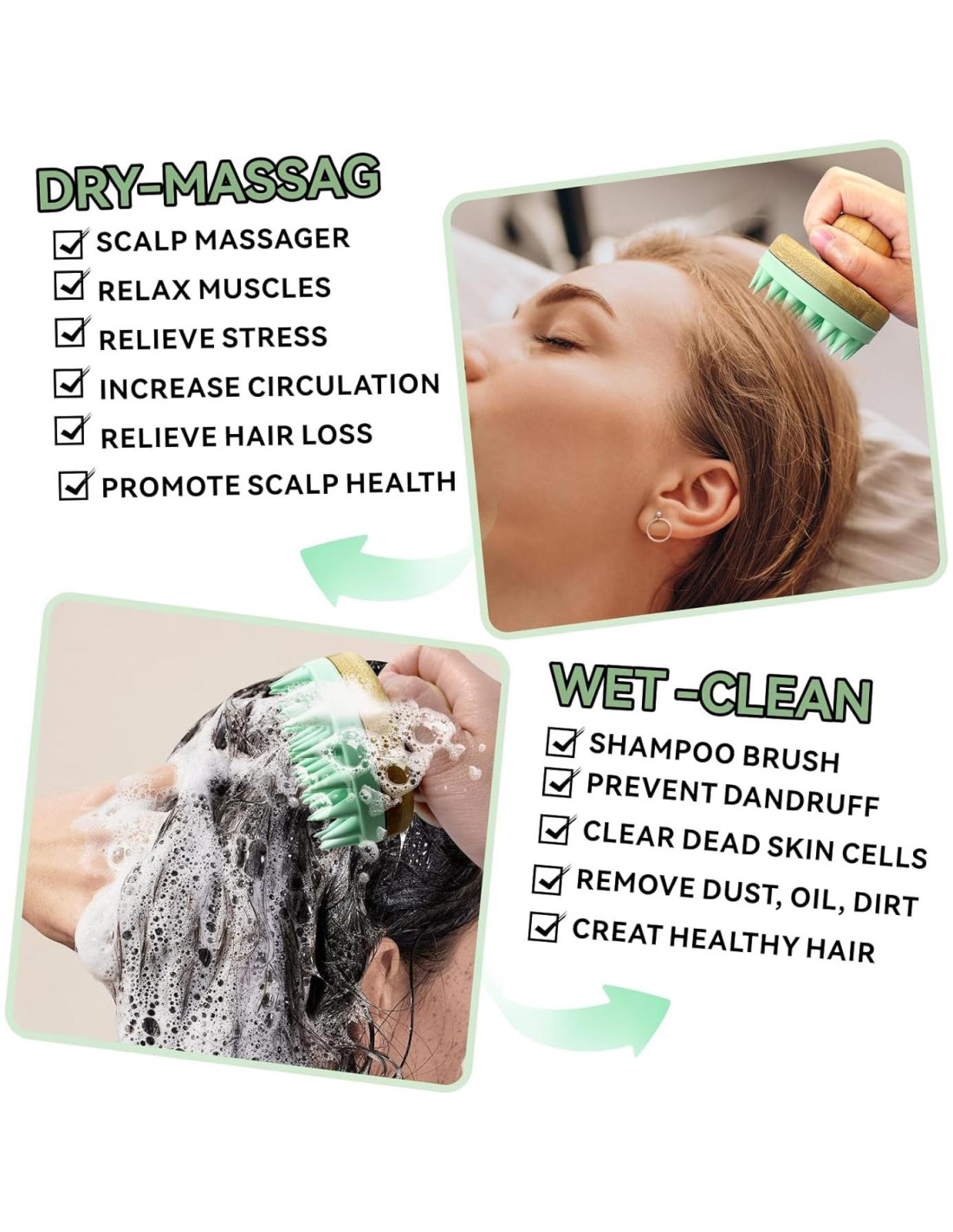 - [Cepillo de Masaje para el Cuero Cabelludo] Nuestro masajeador de cuero cabelludo está hecho de silicona natural y bambú sostenible, el exfoliador de cuero cabelludo ecológico es más duradero y saludable que el cepillo de cabello húmedo de plástico. Las cerdas suaves del cepillo para el cabello no generarán electricidad estática y no dañarán el cuero cabelludo. Si tienes una hermosa manicura, el cepillo de champú será una buena opción para proteger tus uñas. Masajeando tu cuero cabelludo con el cepillo de champú, despídete del cabello seco, graso y áspero.