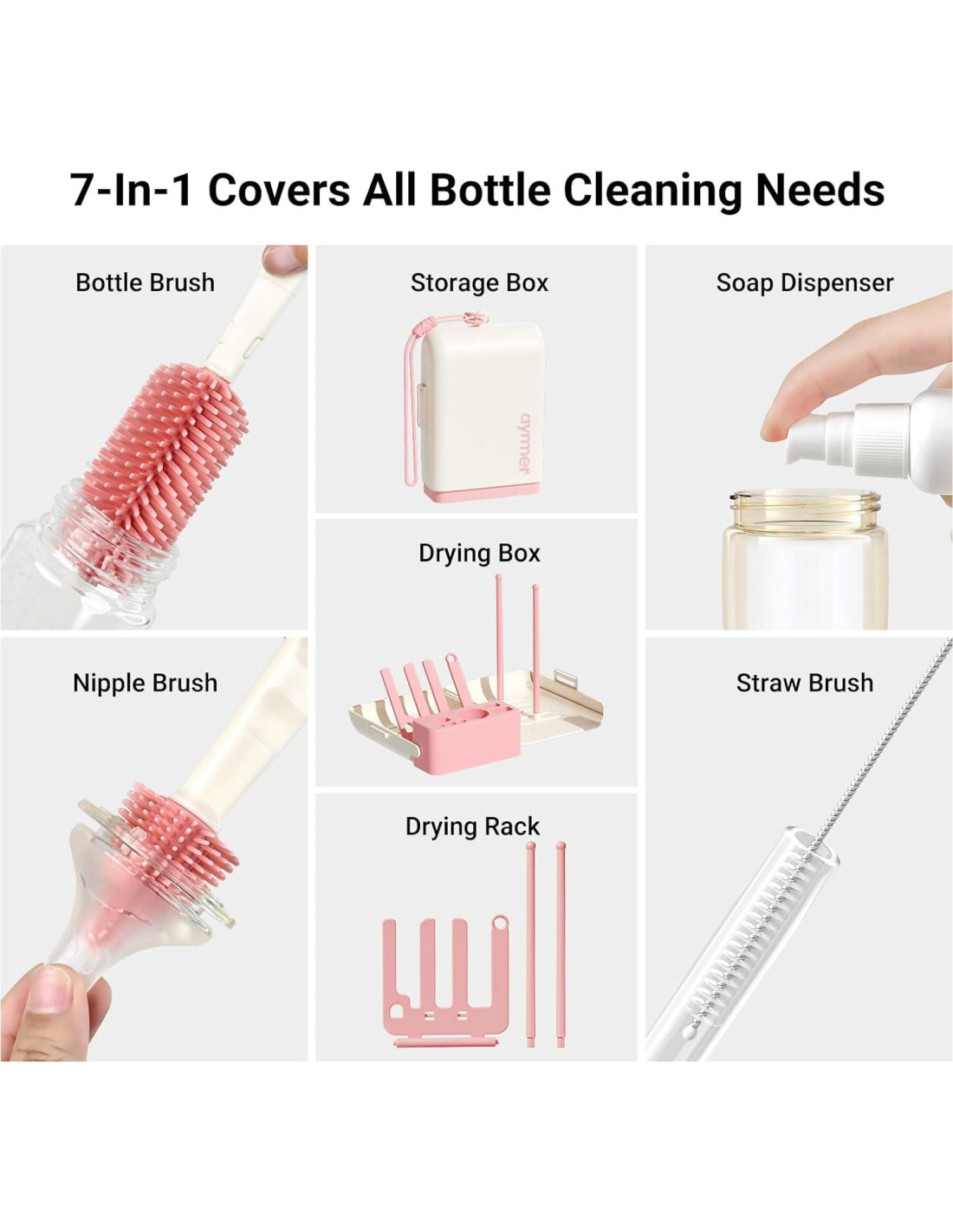 - [Set de Cepillos 7 en 1] Nuestro set de cepillos de silicona para biberones incluye un cepillo para biberones con mango extensible, cepillo para tetinas, cepillo para pajitas, cepillo para limpiar tapas de tazas, dispensador de jabón, soporte de secado y caja de almacenamiento. Puede limpiar 360 todo tipo de biberones y tazas, tanto en interiores como en exteriores, haciendo que la experiencia de padres y bebés sea más cómoda y conveniente.