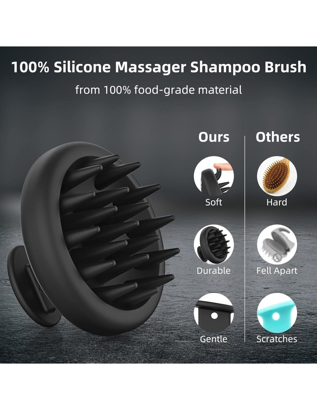 - [Cepillo de Masaje de Champú de Una Pieza] Nuestro masajeador de cuero cabelludo para la ducha está hecho de silicona 100% con un diseño de una pieza, minimizando el moho y la acumulación de agua al reducir los espacios y juntas. Esto mejora la durabilidad y elimina partes expuestas o bordes afilados, haciendo que el masajeador de cuero cabelludo sea más seguro de usar y menos propenso a dañar tu cuero cabelludo o cabello.
