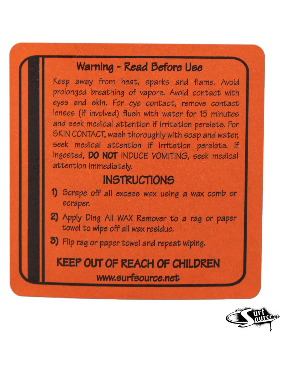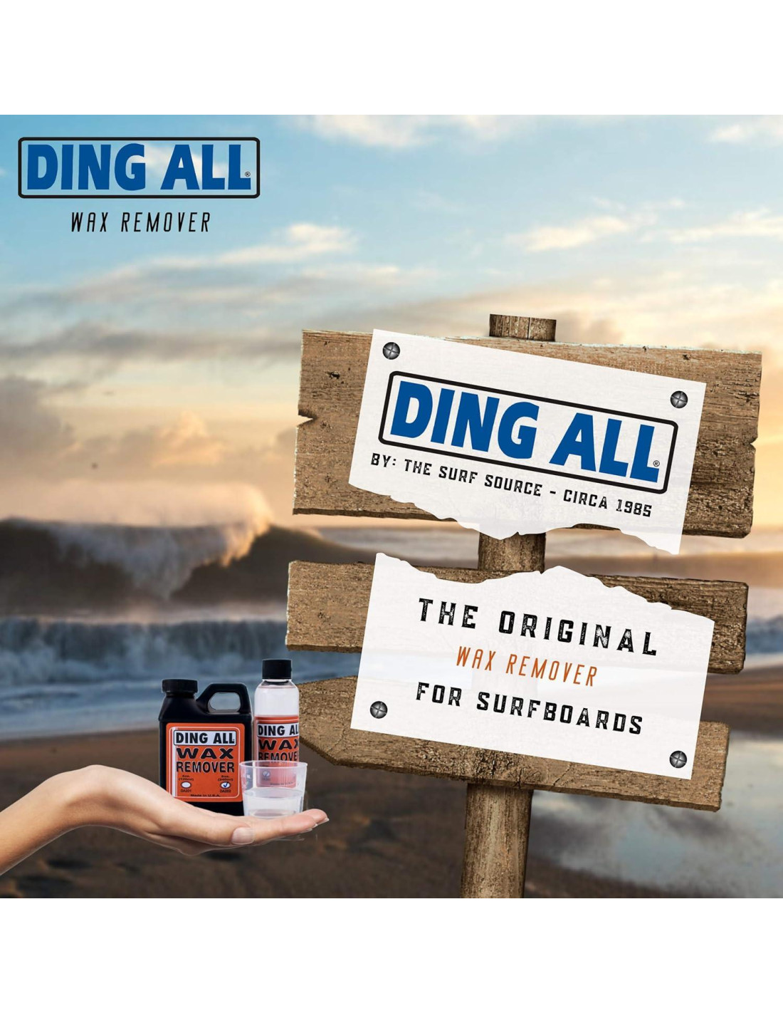 - REMOVEDOR DE CERA LÍQUIDO: El Removedor de Cera de Ding All es un removedor de cera líquida para tablas de surf que lo hace una forma más fácil y económica de eliminar los residuos de cera de la cubierta de tu tabla de surf