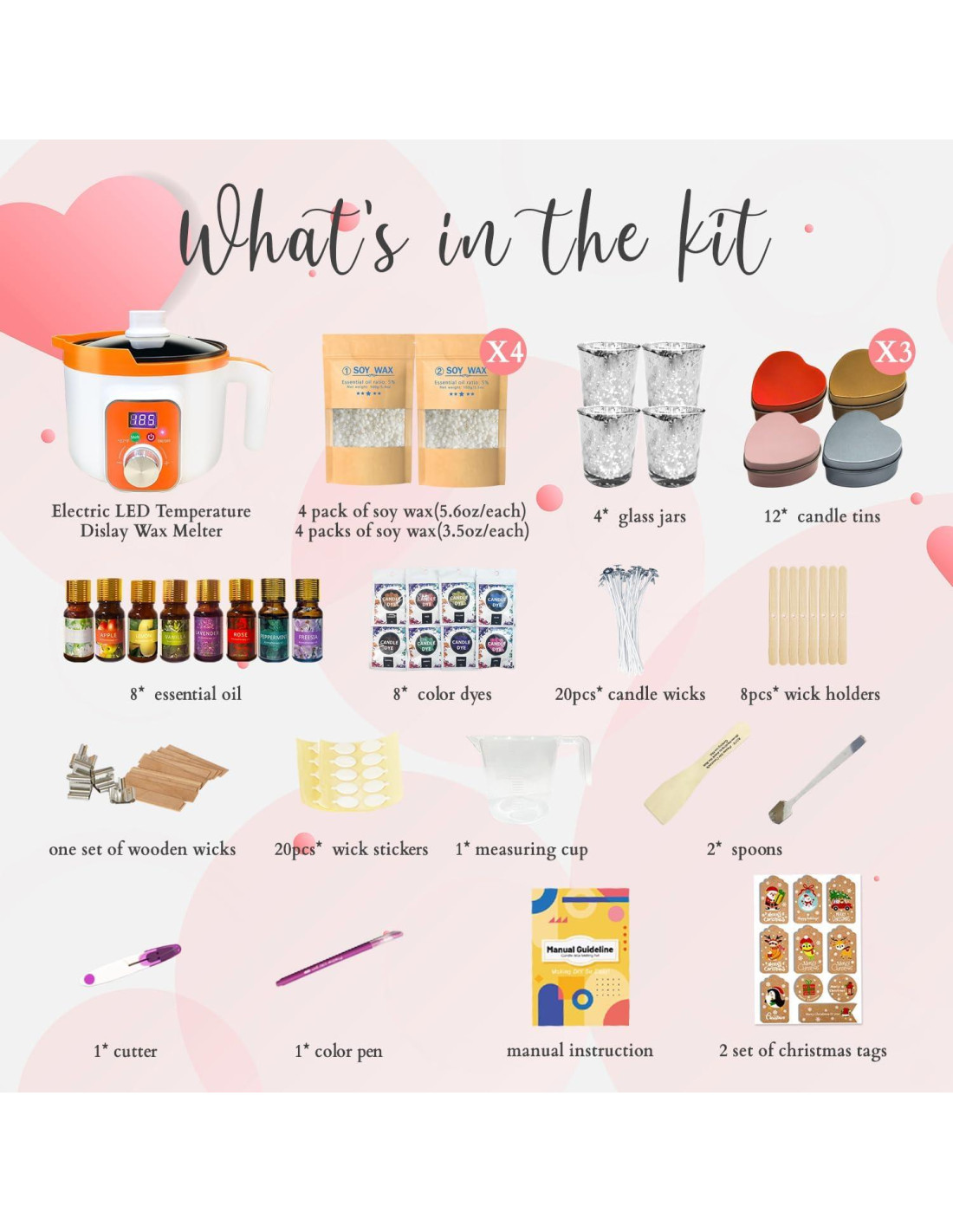 - Kit de Fabricación de Velas: Olla eléctrica de derretir cera con temperatura controlada, 8 paquetes de cera de soya, 12 latas de velas en forma de corazón, 4 frascos de vela plateados, 8 colorantes, 8 aceites esenciales, 20 mechas de vela, 20 pegatinas para mechas, un conjunto de mechas de madera, 12 soportes para mechas, 1 conjunto de etiquetas navideñas, instrucción manual, 1 taza medidora, 1 cortador, 1 bolígrafo de color, 2 cucharas.