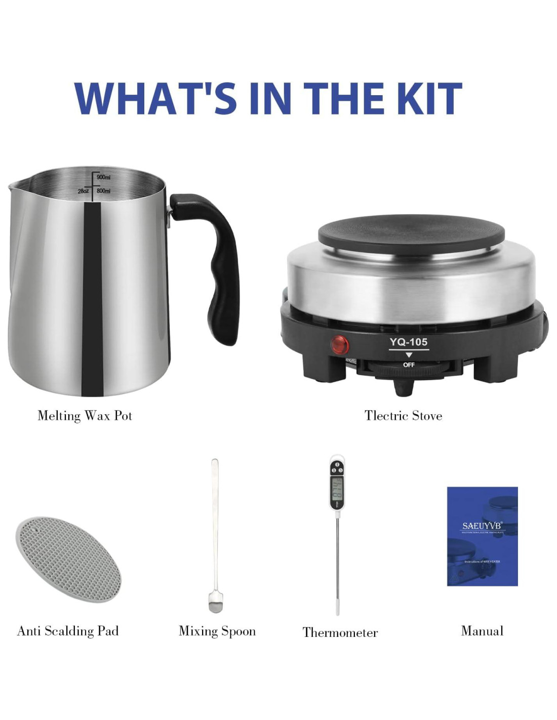 - [Kit completo de fabricación de velas] El kit de inicio para hacer velas incluye 1x olla de derretir velas de 900ml, 1x placa caliente de 500w (negra), 1x cuchara de agitar, 1x termómetro, 1x almohadillas anti-escaldado, 1x manual de usuario y una hermosa caja de regalo.