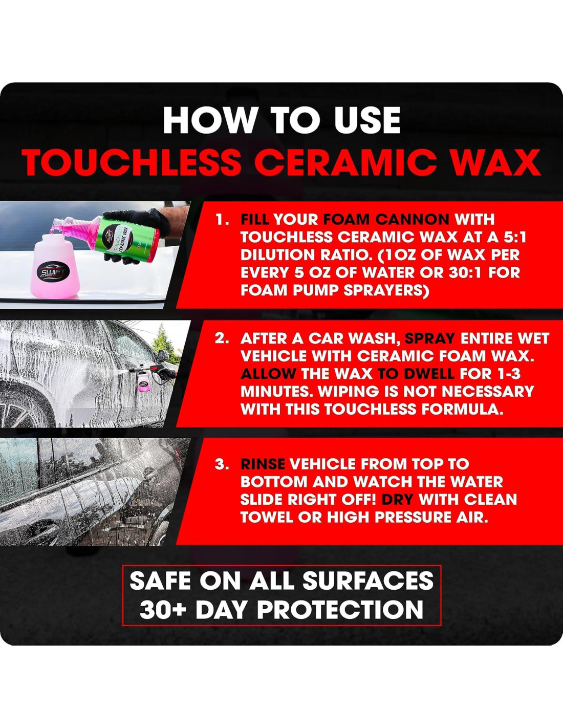 La Cera Espumosa Cerámica Sin Contacto Swift es un producto avanzado de cuidado automotriz que lleva el encerado a un nuevo nivel. Con tecnología de cera espumosa que forma gotas de agua, diseñada para cañones de espuma y pulverizadores de espuma, lograr un brillo alto y brillante nunca ha sido tan fácil. ¡No más limpieza tediosa ni esfuerzo! Después de un lavado de auto, rocía espuma sobre un vehículo limpio y mojado, déjalo actuar durante 2-3 minutos y luego enjuaga. Disfruta del agradable aroma a chicle mientras rocias. Esta fórmula sin contacto elimina la necesidad de encerado manual, frotar o limpiar, ahorrándote tiempo y esfuerzo. Ten en cuenta que este producto no está destinado a crear espuma espesa ya que no es un agente de limpieza, ¡sino una cera! Más allá de su impresionante brillo y acabado sedoso, la Cera Sin Contacto ofrece una protección cerámica excepcional de SiO2, formando una capa hidrofóbica que repele el agua con una acción extrema de formación de gotas. Esta barrera protectora protege tu vehículo de elementos dañinos como rayos UV, suciedad, escombros, sal y otros contaminantes de la carretera. ¡La forma más conveniente y efectiva de encerar tu auto, y especialmente tu camión, remolque, RV o cualquier otro equipo o vehículo grande! Nuestra cera es segura para pintura, vidrio, plástico, goma, cromo, pulido, aluminio, acero inoxidable, así como para vehículos con recubrimiento cerámico, envueltos en vinilo y con película de protección de pintura. Esta fórmula es super concentrada y la dilución recomendada (5:1) es de 5oz de agua por cada 1oz de concentrado de cera. ¡Di adiós al estrés del encerado laborioso y da la bienvenida a la alegría de la conveniencia sin contacto!