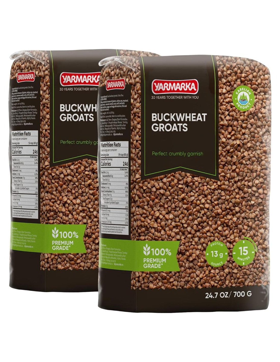 El trigo sarraceno seleccionado está hecho de las mejores variedades de trigo sarraceno cultivadas en Rusia. El cereal se trata con calor para realzar el sabor y darle un agradable color marrón y reducir la duración de la cocción. La marca Yarmarka utiliza equipos de escaneo especializados que garantizan productos de la más alta calidad al medir el tamaño y la forma, mientras eliminan los desechos innecesarios. Las propiedades beneficiosas del trigo sarraceno se conocen desde hace mucho tiempo; este es uno de los cereales más saludables. Es rico en proteínas, vitaminas B, hierro y fósforo, zinc y magnesio. Contiene grasas, pero especiales, poliinsaturadas, así como fibra dietética. Los granos ayudan al cuerpo a combatir el exceso de peso y a reducir los niveles de colesterol. Por lo tanto, la dieta de trigo sarraceno es tan popular entre aquellos que desean perder peso. El trigo sarraceno contiene rutina - vitamina P, que fortalece las paredes de los vasos sanguíneos, y participa directamente en los procesos redox). Instrucciones de cocción: 1-2 porciones: 1. Vierte 100 g (3.53 OZ) (1/2 taza) de trigo sarraceno en agua hirviendo con sal (250 ml) (8.45 fl oz). 2. Cocina a fuego lento durante 15 minutos a fuego medio con la tapa bien cerrada. Es importante no abrir la tapa hasta el final de la cocción, porque el trigo sarraceno debe ser al vapor. Instrucciones para microondas (1-2 porciones): Vierte 100 g (3.53 OZ) (1/2 cucharada) de trigo sarraceno en un recipiente resistente al calor y vierte 300 ml (10.14 fl oz) (1 cucharada) de agua sobre él. Sal y pon en el horno. Cocina durante 12 minutos a 750 vatios. Valor energético (100g) - 310 kcal Valor nutricional: Proteínas, g: 13 Grasas, g: 3 Fibras, g: 10 Carbohidratos, g: 57 Vitaminas (100g) mg: B6-0.2, PP-5.1, B1-0.2, B2-0.3
