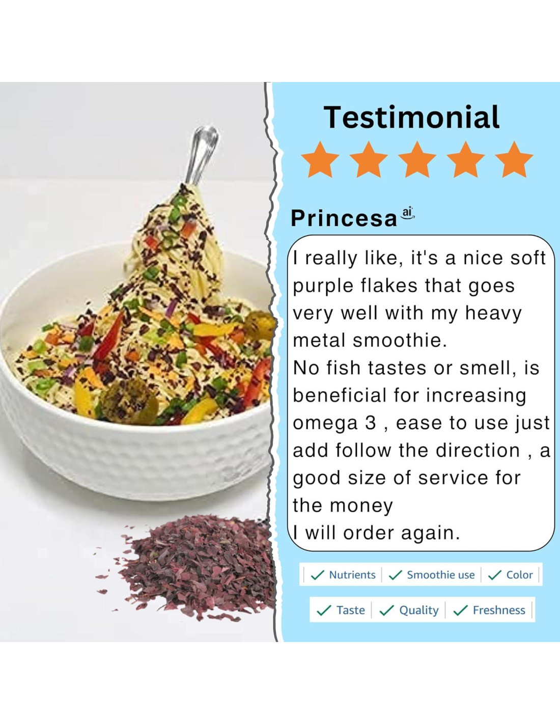 - USO: Alto en proteínas, vitaminas y minerales, los copos de dulse añaden un sabor salado y marino a cualquier plato; Disfruta como un complemento en sopas, ensaladas, mariscos, guisos, sushi y salteados; Tosta hasta que esté crujiente y desmenuza sobre papas, pasta, pizza y palomitas; Añade un toque del mar a todos tus platos y aderezos favoritos para aumentar el sabor y la nutrición; ¡Es un gran sustituto de sal rico en minerales!