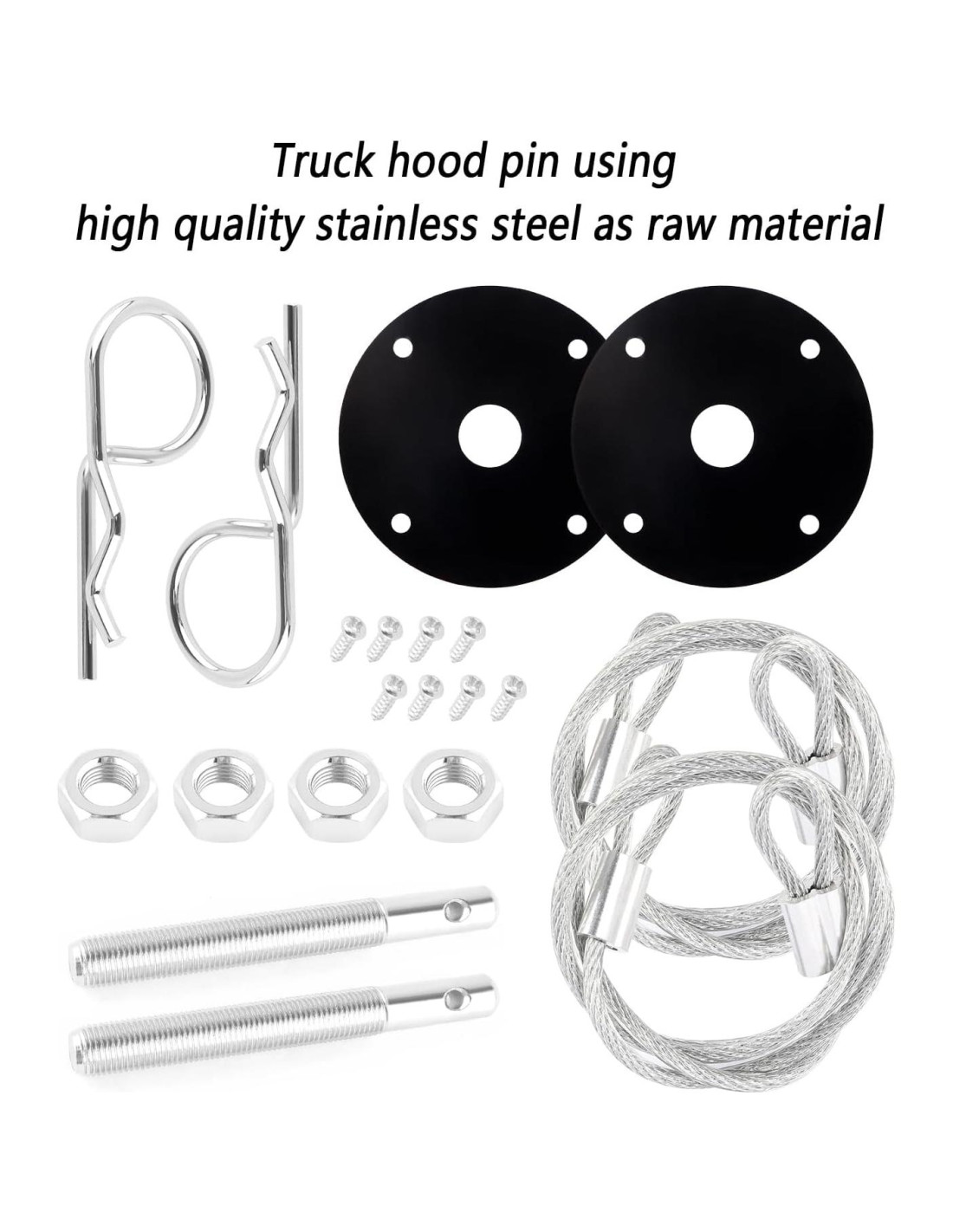 - Lo Que Puede Esperar Recibir: El embalaje contiene 2 pines roscados, 2 ganchos, 4 tuercas, 2 arandelas, 2 lanyards de carreras y 8 tornillos pequeños. Durante la instalación, tenga cuidado de no apretar demasiado el pin de capó para evitar que se deforme.