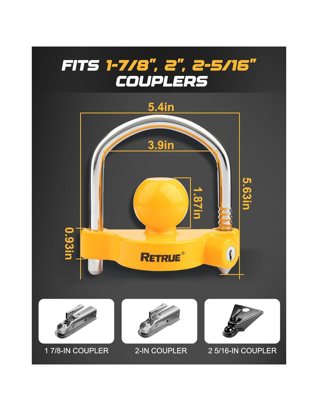 - Ajuste Universal: La cerradura de acoplador de remolque Reture está diseñada para ser ajustable con 11 posiciones de bloqueo y se ajusta a acopladores de 1-7/8" (4.76 cm), 2" (5.08 cm) y 2-5/16" (5.87 cm). Se incluyen 2 llaves