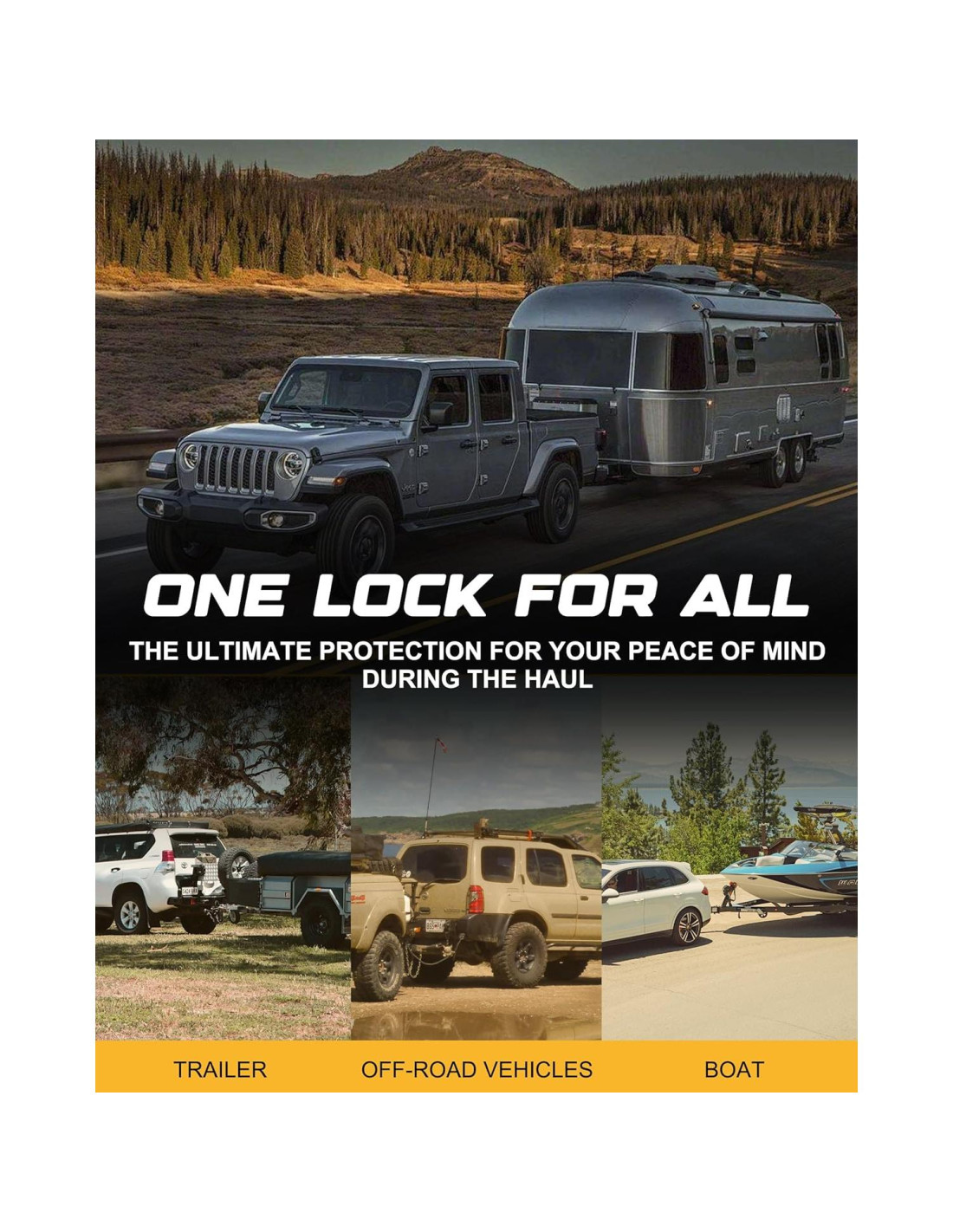 - Visión Mejorada: En la premisa de asegurar que la cerradura del enganche no sea cortada, hemos mejorado la apariencia de la cerradura, siendo más compacta y plana. El uso de un color amarillo brillante y disuasorio proporciona una protección duradera y altamente visible para los remolques