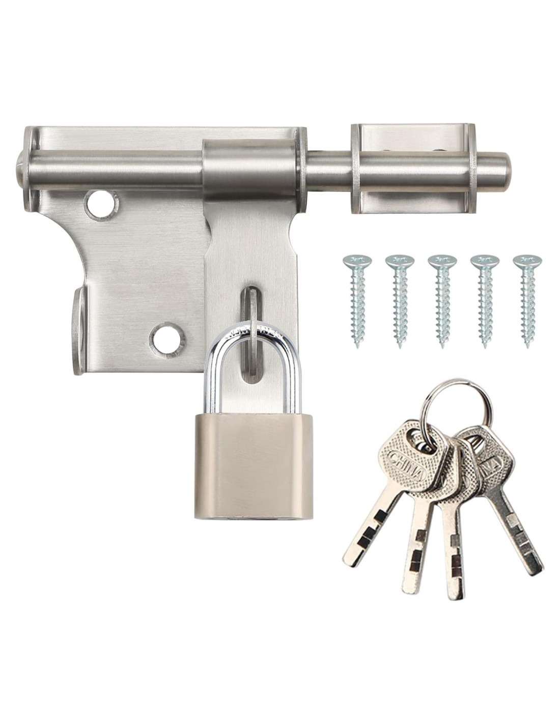 - Tamaño Grande y Diseño de Alta Resistencia 11.81 cm * 6.81 cm (L*W), El peso: 180 g, varilla de pestillo de acero inoxidable sólido de 10 mm, cuerpo de pestillo de metal engrosado, moldeado en una sola pieza sin soldadura, diseño de alta resistencia y robusto, aumenta considerablemente la seguridad. El paquete incluye: 1x Pestillo y 5 x Tornillos, 1 x Candado y Llaves; Por favor, verifica antes de comprar si las dimensiones cumplen con tus necesidades.