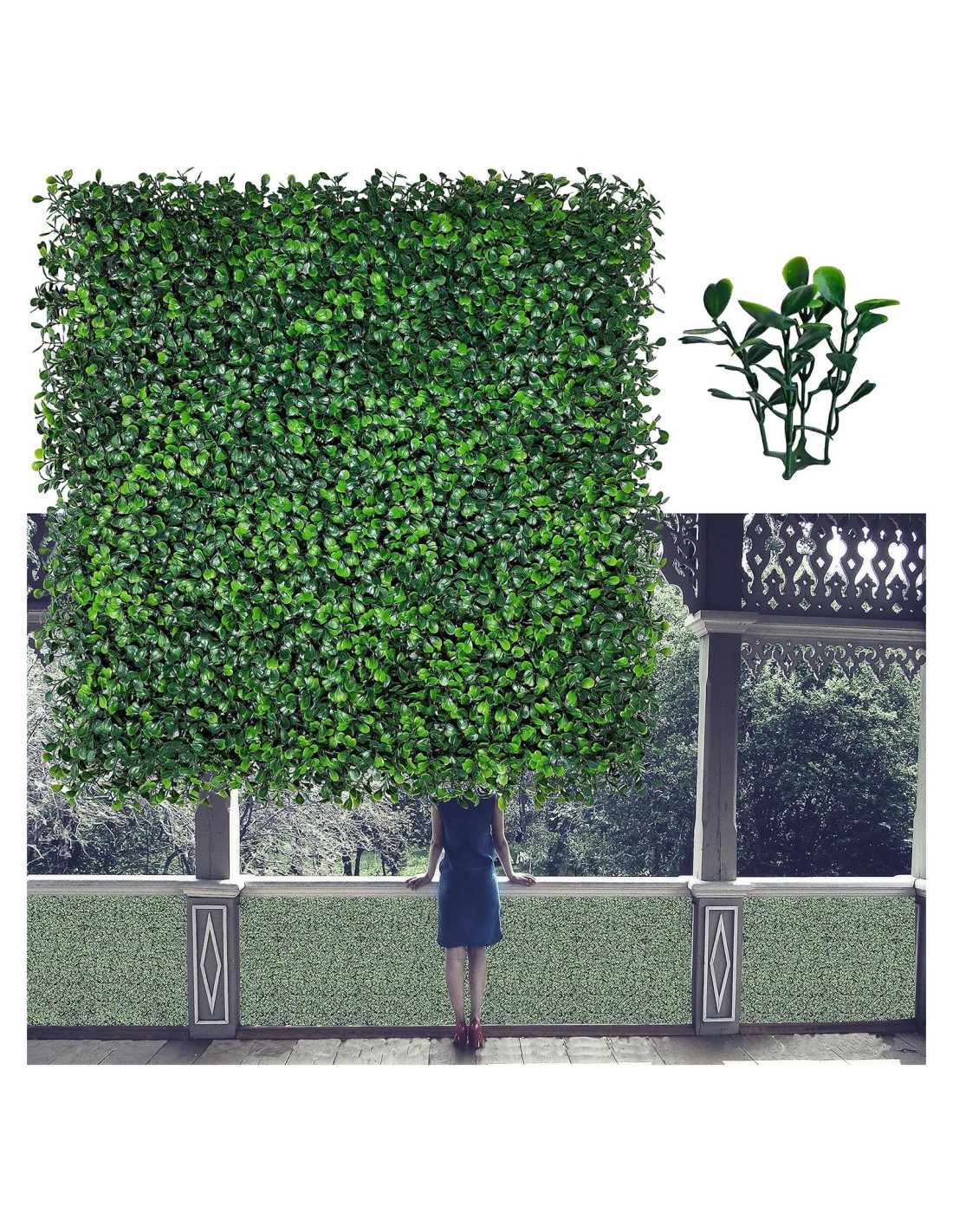 - Cada paquete tiene 6 paneles de boxwood, cada panel de césped mide 20x20 pulgadas (50,8 cm x 50,8 cm), que puede cubrir 16.7 pies cuadrados (1,55 m). La altura de las hojas falsas es de 2 pulgadas (5,08 cm) (hojas de 4 capas), lo que tiene un efecto 3D perfecto. Cada panel tiene 400 hojas falsas, que son densas y pueden cubrir el fondo al 100%. Se incluyen 50 nuevas bridas.