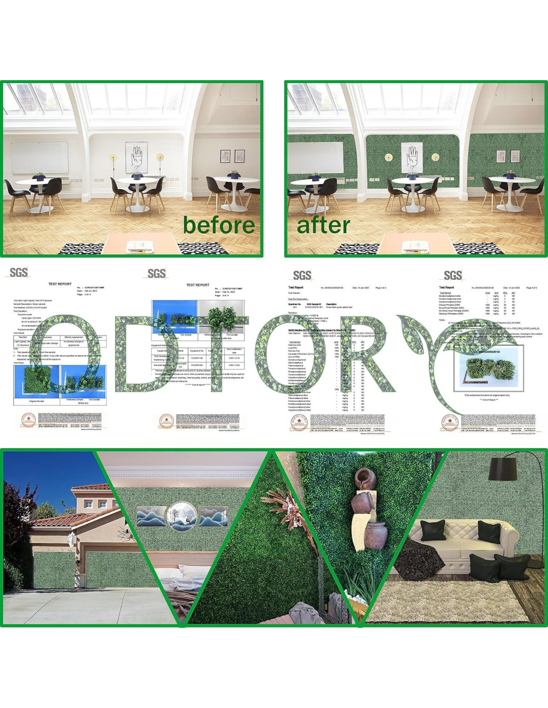 - Debido al embalaje y transporte, las hojas del panel de césped que recibió pueden estar aplastadas y pueden parecer un poco escasas. No se preocupe, colóquelo al sol durante 1-3 horas para que las hojas se levanten nuevamente. Restaure su belleza original. O cepillar las hojas con las manos también puede ayudar a que se recupere. Si tiene alguna pregunta sobre este panel verde, no dude en contactarnos.