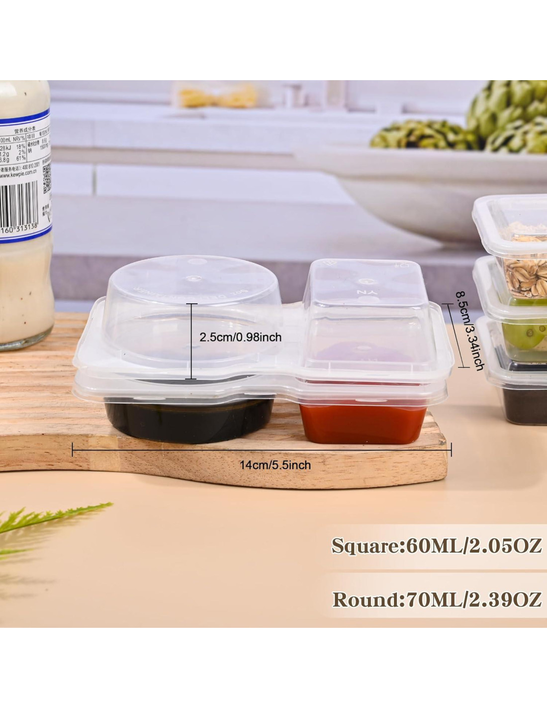 - [Diseño de 2 Compartimentos] Los contenedores de snack reutilizables con tapas de 2 contenedores de snack, se pueden usar tanto para condimentos como para snacks. Este diseño permite un almacenamiento y transporte conveniente de diferentes alimentos, puede evitar completamente la mezcla de sabores de los alimentos y mantener la frescura de los alimentos