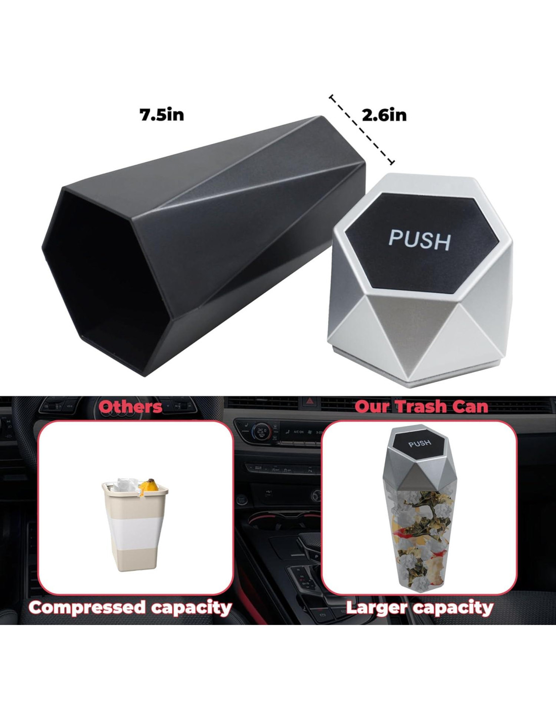 - Conveniente: El basurero de coche cuenta con una tapa de botón de presión que asegura el uso conveniente del artículo. La tapa "PUSH" se abre fácilmente y se cierra automáticamente, permitiendo tirar la basura fácilmente. El basurero de coche es más que un elemento esencial para el coche