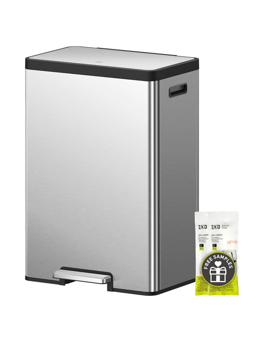 El Cubo de Basura de Reciclaje EcoCasa II 20L + 20L simplifica todo el estilo elegante de nuestro popular modelo EcoCasa en un perfil más delgado que ahorra espacio y se coloca al ras contra su pared o gabinete. La configuración de doble compartimento ofrece dos forros internos iguales de 20L (5.3 galones cada uno) para separar fácilmente la basura reciclable de los desechos domésticos regulares. El acabado de acero inoxidable resistente a huellas dactilares se extiende a la tapa de cierre suave, que funciona con un mecanismo de pedal de pie duradero y de voladizo. Y la función de mantener abierta sostiene la tapa levantada cuando la necesita con solo deslizar un botón. Cada cubo interno extraíble tiene un estabilizador de bolsa para evitar que su bolsa de basura se deslice hacia abajo, por lo que sacar la basura y los reciclables es muy fácil. Hay un compartimento desodorante incorporado para ayudar a mantener las cosas frescas entre los cambios de bolsa. Capacidad: 20L + 20L (5.3G + 5.3G). Dimensiones: 44.9 cm (17.7") W X 33.4 cm (13.1") D X 65.5 cm (25.8") H. Equipo de soporte al cliente basado en EE. UU.