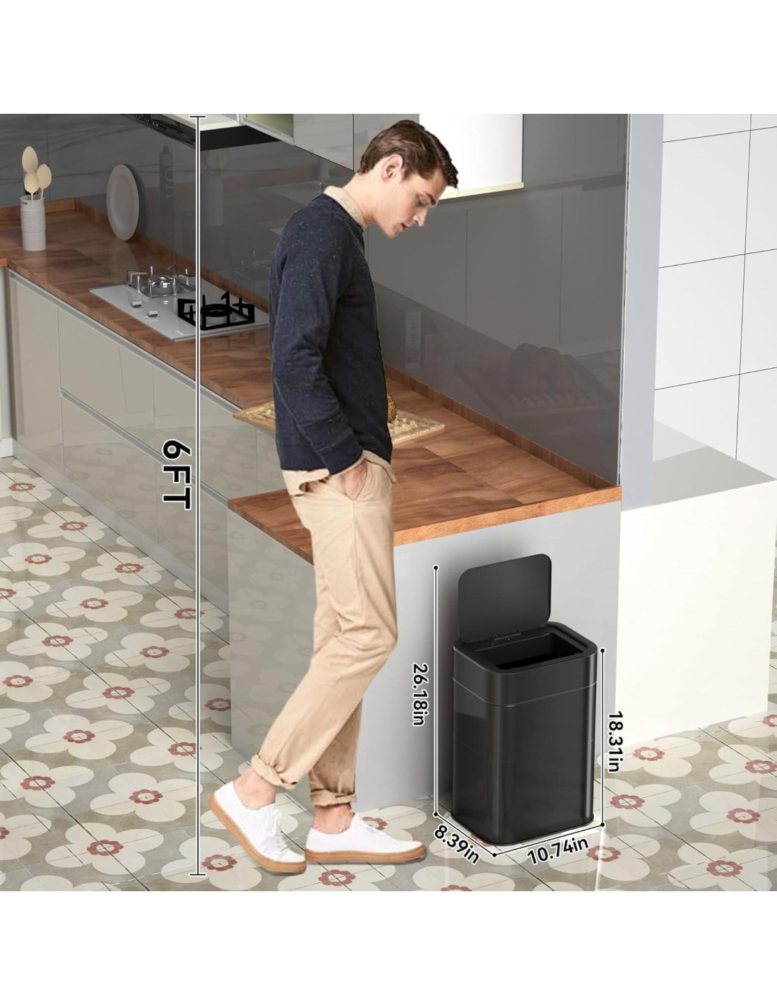 - CONVENIENCIA SIN MANOS: Agita la mano para abrir/cerrar la tapa del basurero con sensor de movimiento, manteniendo las manos limpias al cocinar o manejar desechos. Perfecto para hogares ocupados y usuarios conscientes de la higiene.