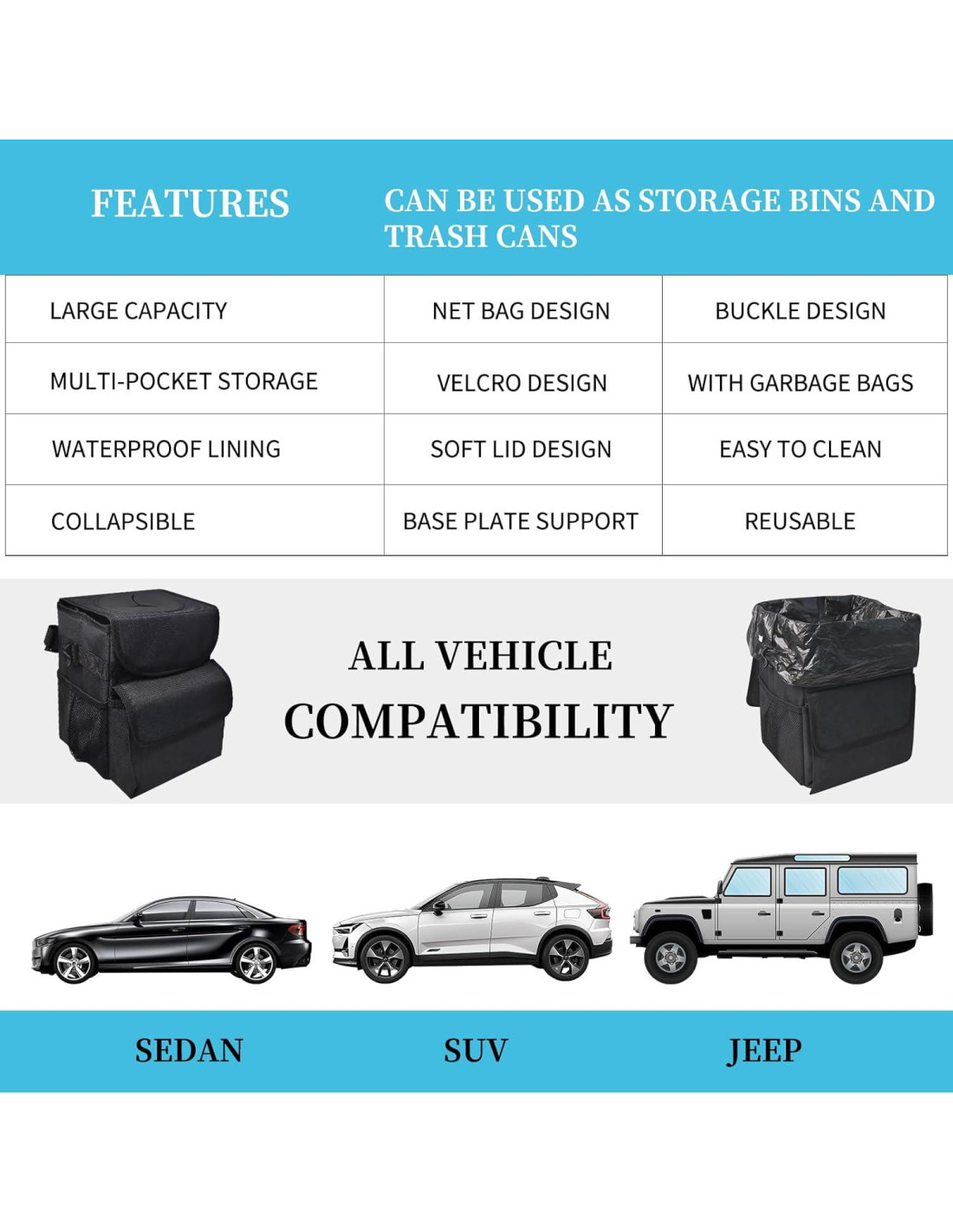 - Basurero de coche: Para no ocupar espacio en tu coche, diseñamos este basurero para que sea plegable, haciéndolo más fácil y agradable de usar. El interior está hecho de tela EVA impermeable, que es impermeable, a prueba de fugas y fácil de limpiar. También puedes verter agua sin empaparte.