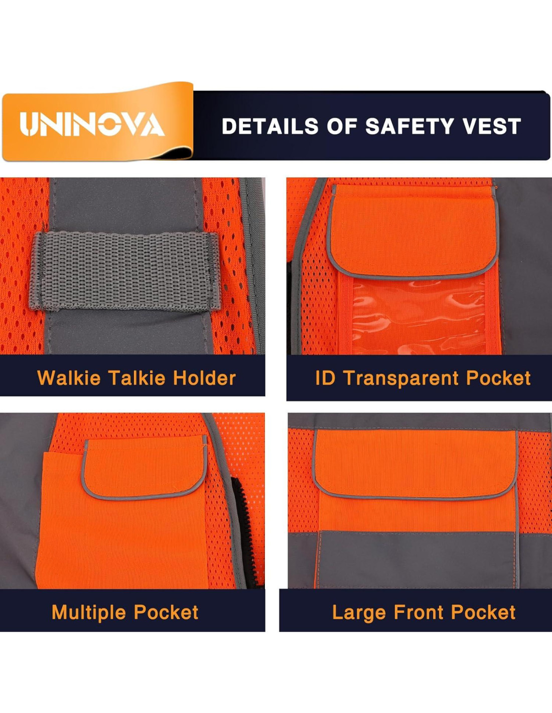 - BOLSILLOS MULTIFUNCIONALES Este chaleco de seguridad UNINOVA viene con 6 bolsillos frontales, 2 sujetadores de micrófono y un anillo en D, perfecto para teléfono celular, micrófono, linterna, bolígrafos, puntero láser y tarjetas de presentación