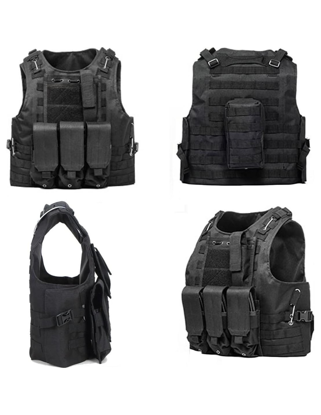 - Bolsas Molle 1 bolsa triple para cargadores de rifle, 1 bolsa para mapa y linterna, 2 bolsas de comunicación y 1 bolsa de herramientas. Todos los accesorios pueden ser desmontados y reorganizados. Un gran chaleco táctico modular para juegos de Airsoft y Paintball.