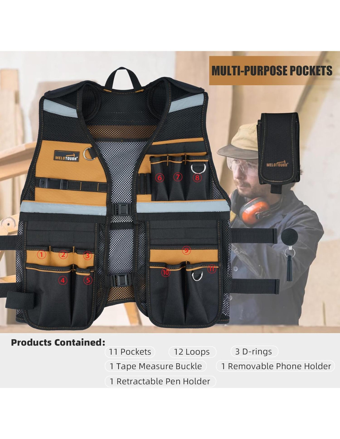 - ALMACENAMIENTO MULTI-BOLSILLO: El chaleco de herramientas para carpinteros incluye 11 bolsillos, 11 lazos, 3 anillas en D, 1 hebilla para cinta métrica, 1 lazo para martillo, y viene con 1 soporte de teléfono removible y 1 soporte de bolígrafo retráctil para satisfacer tus diversas necesidades de almacenamiento.