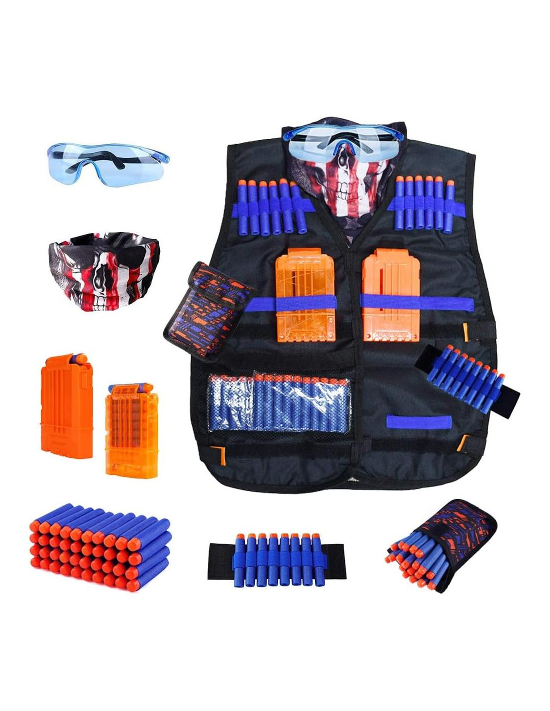 - Chaleco Táctico Nerf para Niños - 1 x Chaleco; 1x Bolsa de Dardos; 1 x Máscara Táctica; 1 x Gafas Protectores; 1 x Banda de Muñeca; 40 x Dardos de Repuesto; 1 x Clips de Recarga; 1 x Clips de Recarga Transparente; ¡Suficiente potencia de fuego para guerras de pistolas Nerf!