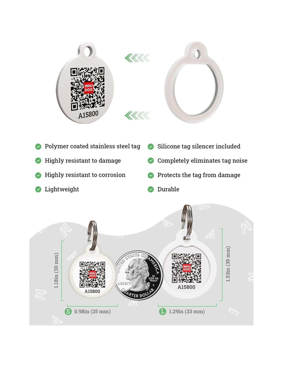 - Material Duradero - Las etiquetas para perros están hechas de acero inoxidable recubierto de polímero. Incluye un silenciador de etiqueta de perro de silicona que hace que la etiqueta del collar del perro sea silenciosa. Protege la etiqueta silenciosa del perro de daños y extiende la vida de la etiqueta de identificación de la mascota.