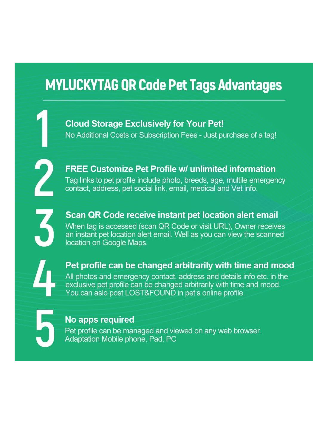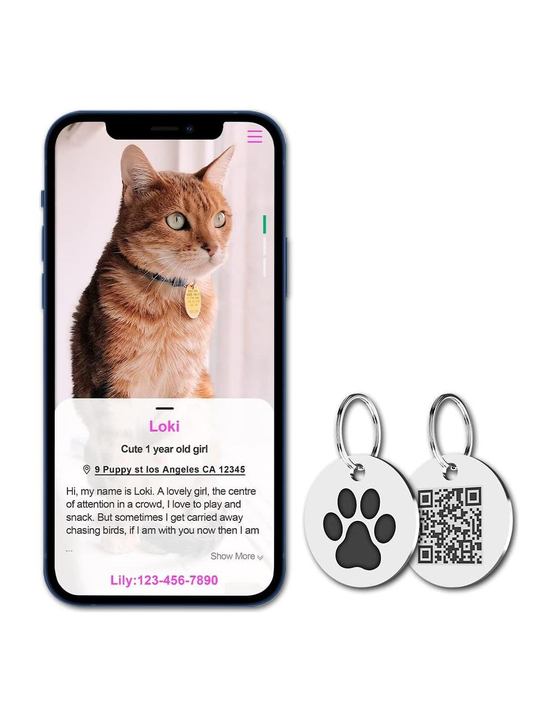 - [Configuración y uso] Escanea el código QR de la etiqueta para activar la etiqueta, enlaza a una página de perfil de mascota gratuita, puedes ingresar múltiples contactos de emergencia / subir múltiples fotos de mascotas / Dirección de Casa / Información Médica, etc. de tu mascota. Una cuenta puede gestionar múltiples mascotas. ¡NO SE REQUIERE APLICACIÓN!