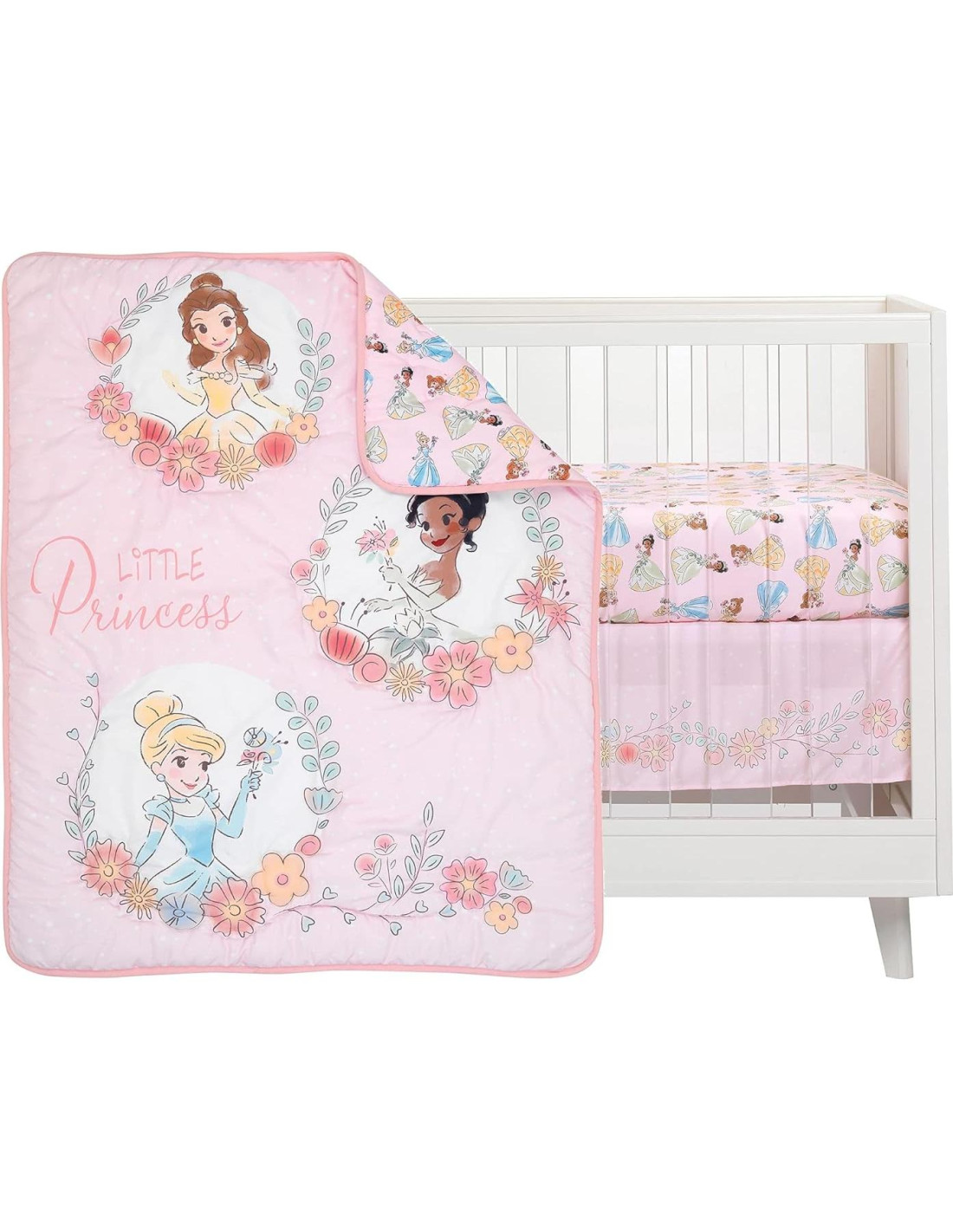 Este encantador conjunto de ropa de cama de Disney Princesas, con licencia oficial, incluye una colcha, una sábana ajustable para cuna y una falda de cuna. La colcha presenta a tres Princesas de Disney, Bella (La Bella y la Bestia), Tiana (La Princesa y el Sapo) y Cenicienta. Las tres princesas llevan sus vestidos de baile favoritos. Bella en amarillo, Tiana en verde y Cenicienta en azul. Un borde floral en colores pastel rodea a cada princesa. La sábana ajustable para cuna tiene un fondo rosa y presenta a las tres princesas. La sábana tiene elástico por todo su alrededor, asegurando un ajuste seguro y seguro en un colchón de cuna de tamaño estándar que mide 132 cm x 71 cm. La falda de cuna rosa tiene estrellas blancas dispersas y una encantadora guirnalda de flores en pastel. Este conjunto está hecho de una suave tela de microfibra que es ecológica y lavable a máquina para un fácil cuidado.