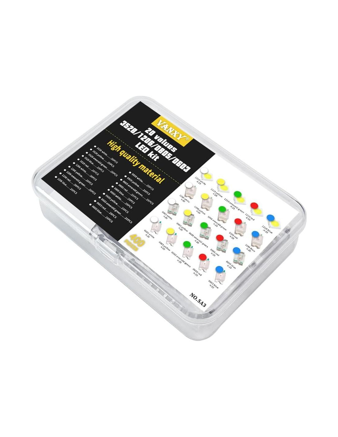 - 400Pcs Kit LED SMD de múltiples tamaños. Incluye 20 tipos * 20 piezas (1210/1206/0805/0603) en Blanco, Amarillo, Rojo, Azul, Verde, ideal para diseño de circuitos, reparaciones y proyectos de iluminación DIY.