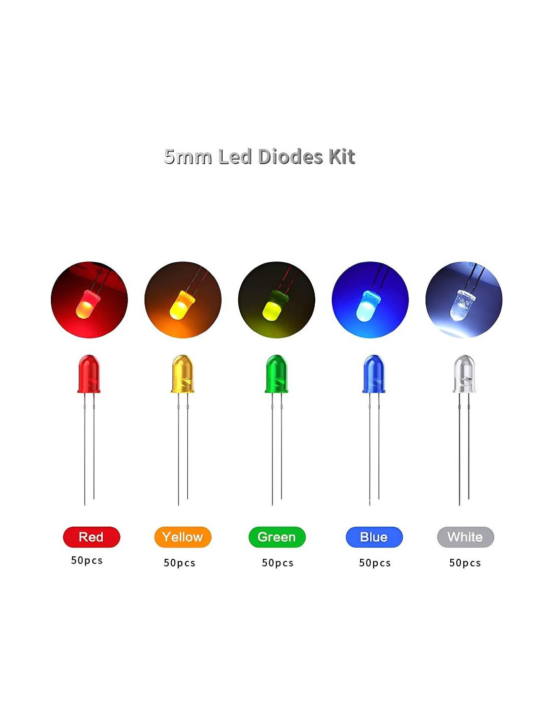 - Paquete Variado: Este kit de diodos LED incluye 250 piezas en 5 valores diferentes - 50 pcs cada uno de diodos rojos, amarillos, verdes, azules y blancos de 5mm.