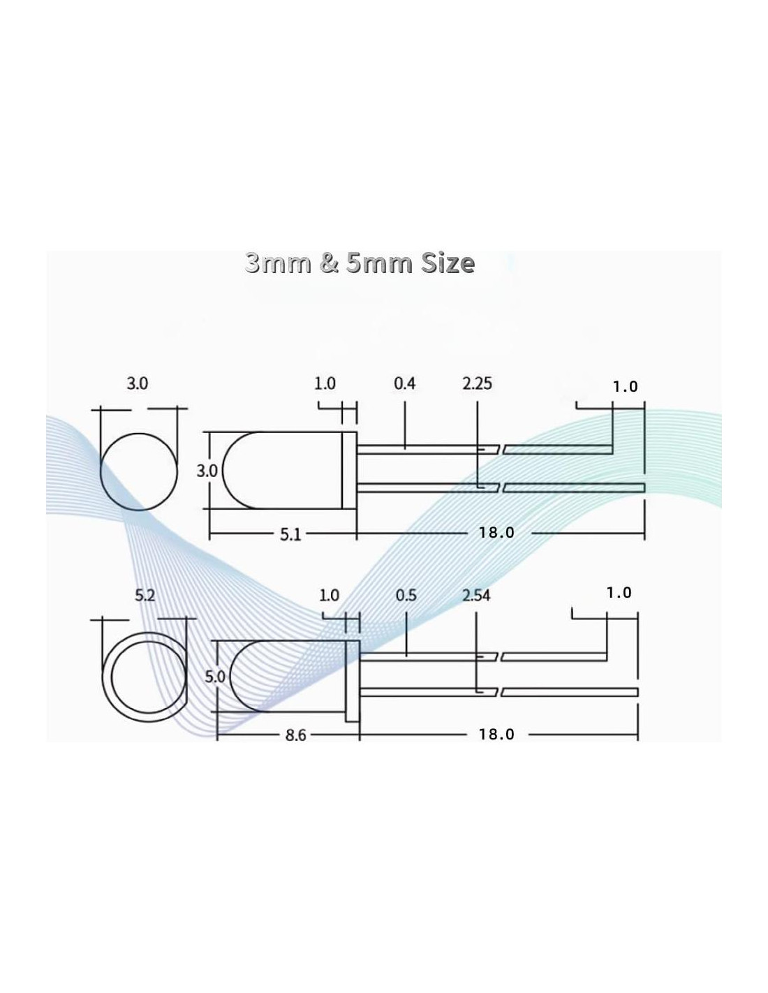 - Tamaños Versátiles: Presenta dos tamaños populares de LED - 3mm (0.12 in) (3.05 mm) y 5mm (0.2 in) (5.08 mm) de diámetro, permitiéndote elegir el ajuste perfecto para tus proyectos electrónicos.