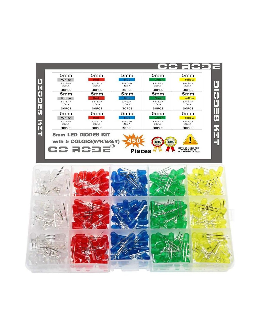 Kit de Diodos Emisores de Luz de 5mm con 5 colores (Blanco/Rojo/Azul/Verde/Amarillo) Aplicación: Usar para Proyecto DIY de Arduino, Experimento Electrónico, Enseñanza, Reparación de Juguetes y electrodomésticos Característica: *Diámetro de la Cabeza: 5mm, Longitud del Pin: 17-19mm *Color de Luz Emitida: Blanco/Rojo/Azul/Verde/Amarillo (cada color 90pcs) *Bajo consumo de energía, Larga vida útil. *Longitud de Onda: Rojo: 620-625nm Amarillo: 589-591nm Azul: 460-465nm; Verde: 517-520nm *Ángulo de Visión: 15~30 Grados; *Voltaje: Blanco 3.0~3.4V Rojo 2.0~2.2V Azul 3.0~3.4V Amarillo 2.0~2.2V Verde 3.0~3.4V; *Corriente Máxima: 20mA LED de calidad de CO-RODE [ Paquete Incluido ] 450pcs(+/-1%) Diodos LED con una caja de almacenamiento práctica Blanco/Amarillo/Rojo/Azul/Verde: 90pcs cada color Nota: 1) Por favor asegúrese de que el voltaje directo sea de acuerdo con la instrucción en la etiqueta. 2) Corriente Máxima: 20mA
