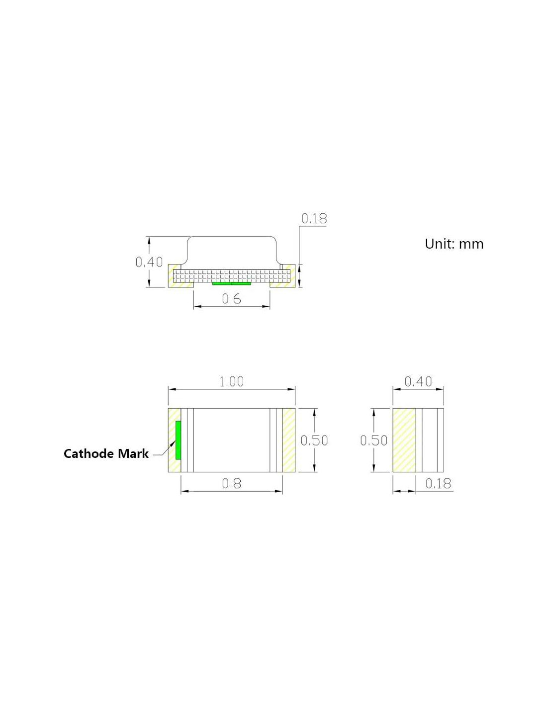 - LED 0402 (0.04x0.02x0.017 in. / 0.1x0.05x0.04 cm) / Cables aislados ultra delgados de 0.01 in. (0.0254 cm) / Longitud de los cables: 7.8 in. (20 cm)